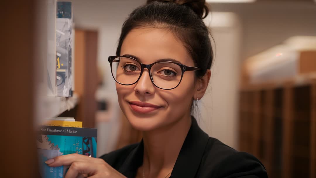 AI Generated Image. Featuring young woman wearing dark blazer and glasses reaching for blue book on wooden shelf, smiling at camera. Medium close-up footage capturing confident expression and direct eye contact, shallow depth of field producing soft background blur and warm tones. Framing allowing left-side negative space for overlay text or logo. Useful for promoting libraries, higher education, student life, professional development, corporate training, literacy campaigns, bookshop marketing, author profiles, editorial features about reading and research. Suitable for website hero banners, social media ads, blog headers, e-learning modules, corporate presentations, recruitment materials. Color grading warm, skin tones natural, composition emphasizing approachability and focus. Clip working well for storytelling about lifelong learning, study habits, library services, campus life, and workplace education.