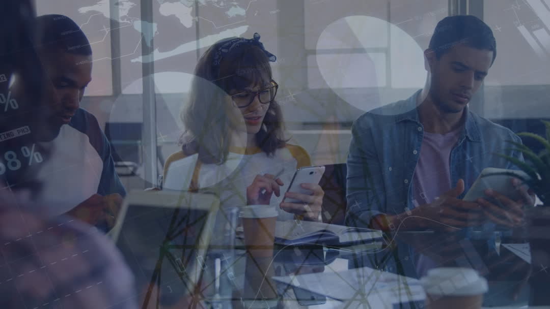 Young professionals engage with their mobile phones and tablet, analyzing financial data in an office environment. The overlay of statistics and graphs implies the use of advanced technology in business collaborations and digital analytics. This can be used to convey themes of modern business practices, financial innovation, teamwork, and the integration of technology in workspaces.