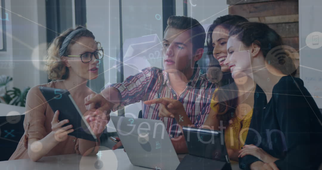 Young professionals engaged in a dynamic discussion about innovative technology contributions to modern business solutions. The overlay of data connections and 5th generation technology signifies forward-thinking approaches and digital transformation. Useful for themes of teamwork, technological advancement, and modern business environments in corporate communications, marketing materials, and technology-related articles.
