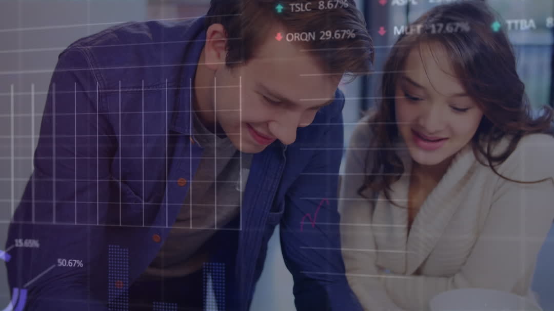 Young Professionals Discussing Financial Data with Digital Overlay Video