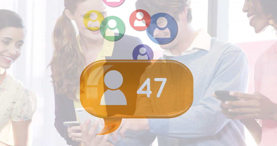 Young professionals using smartphones to engage and expand their online network through social media platforms. Bright graphics of profile icons and a focus on collaboration reflect the increase in online connections. Perfect for illustrating concepts of networking, modern communication tools, and global digital engagement. Suitable for blogs or articles about successful social media strategies, digital networking, and emerging online trends.