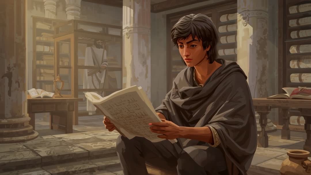AI Generated Image. Video clip showing young robed scholar sitting on stone steps within columned library, holding and reading large handwritten manuscript as warm side light illuminates face and pages. Background featuring shelves of rolled scrolls and bound books, wooden tables with open volumes and weathered stone columns adding historical depth. Camera framing offering medium close-up or slow push-in, capturing focused expression and careful hand movements over fragile text. Color palette leaning toward warm ochre and sepia, creating cinematic contemplative mood. Serving historical documentary sequences, educational videos on manuscript study and preservation, museum exhibit trailers, library promotions, book cover motion clips, course intros, medieval drama scenes and game cinematics. Editing tips: pairing with soft ambient music and subtle room tone, applying gentle film grain and warm color grade, using slow crossfade or push-in to emphasize discovery and focus, cropping for vertical social clips for mobile distribution.