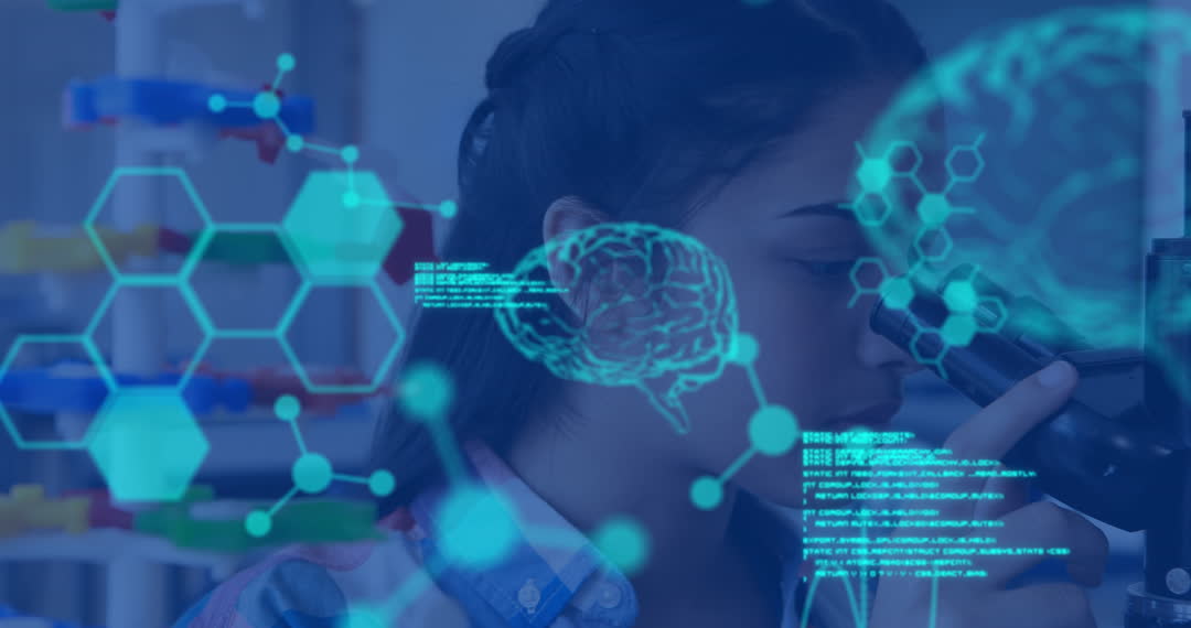 A schoolgirl is using a microscope with a virtual display of data processing and a chemical formula superimposed, suggesting scientific curiosity and learning. This videory is ideal for educational themes, technology in education features, promoting STEM activities for youth, or content related to the integration of digital interfaces in sciences.