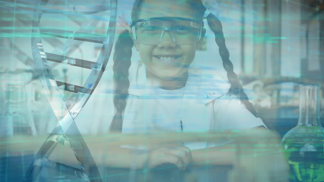 Young girl with goggles smiling in a laboratory, symbolic DNA strand and digital data overlay evoke themes of exploring science and education. Useful for illustrating youth engagement in STEM fields, science education, and the future of genetics research. Captures a blend of human curiosity and technological advancement.