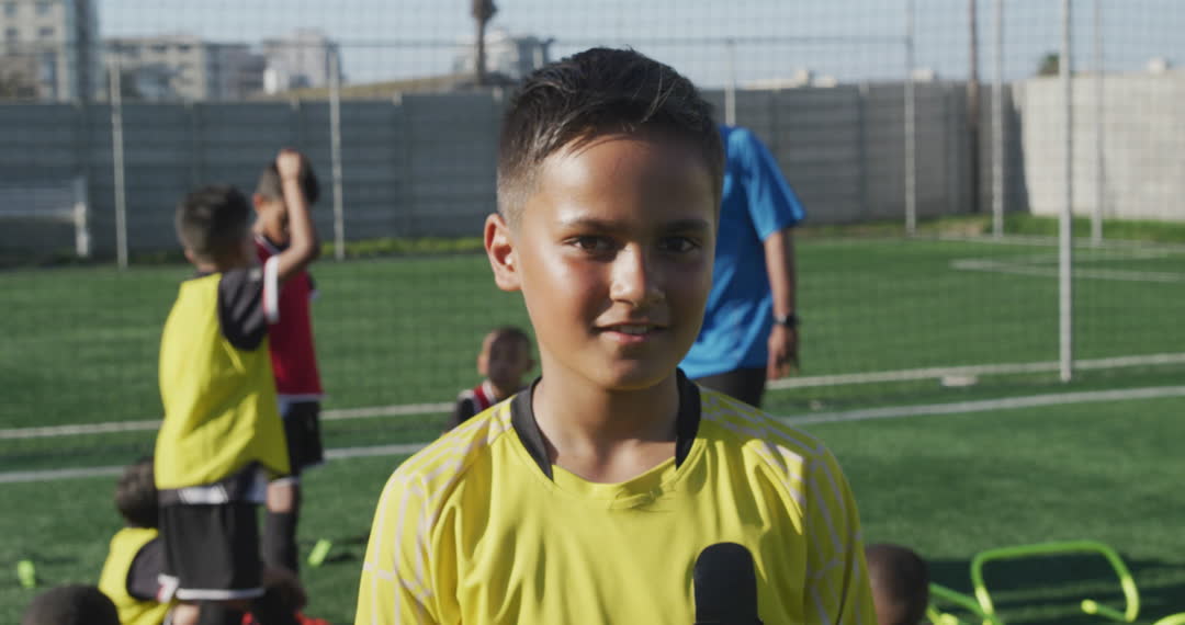 Young soccer player in bright sports attire standing on a grass field after practice. Young athlete looks towards the camera while teammates are preparing in the background. Perfect for use in educational materials, sports advertisements, or promoting youth sports programs.