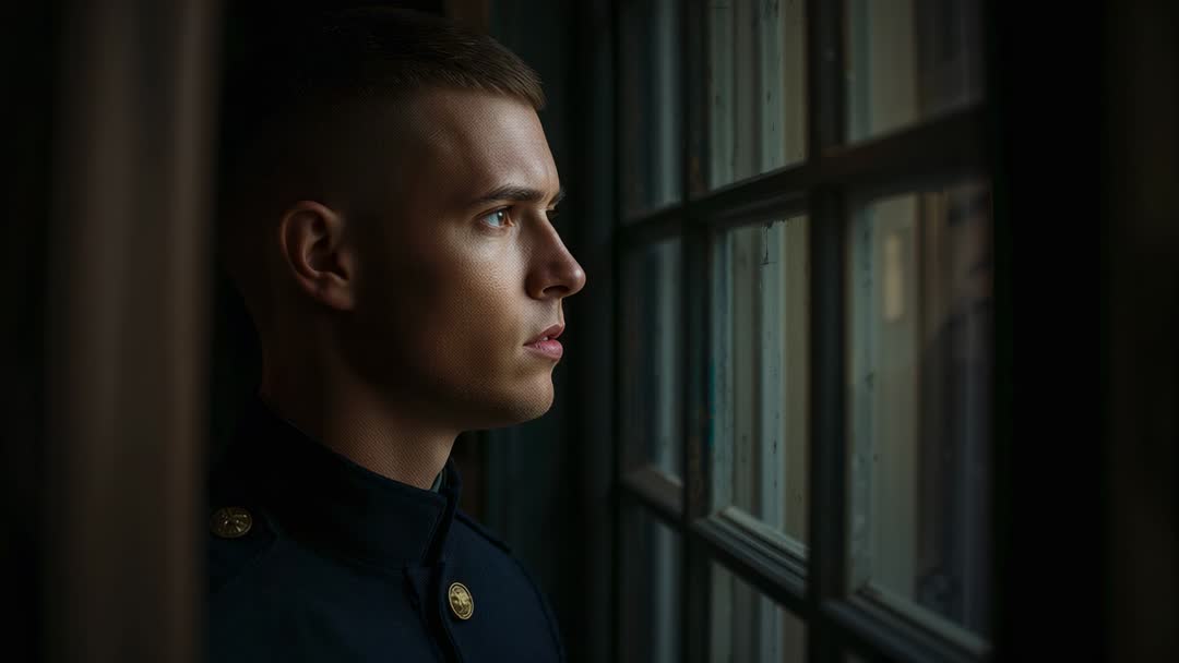 AI Generated Image. Showing dramatic profile of young man in brass-button military-style coat gazing through rain-speckled multi-pane window. Creating cinematic low-light mood conveying introspection, solitude, quiet resolve. Working well for recruitment videos, veteran stories, mental health campaigns, historical drama trailers, duty and service themed content. Suiting website hero banners, social media ads, blog headers, documentary sequences, and promotional reels. Providing negative space at right for overlay text, headlines, logo, or lower-third graphics. Featuring close-up framing and subtle natural light for editorial and commercial use, allowing easy color grading for moody or cinematic projects.