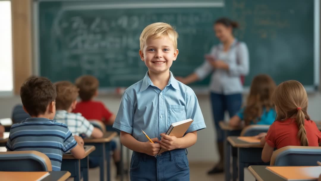 AI Generated Image. Video captures a young student confidently standing and holding a notebook and pencil in a busy classroom, showing active engagement in learning. Background features classmates seated at desks with a teacher reviewing a tablet. Ideal for illustrating educational success, classroom activities, and student participation in school. Useful for educational blogs, school website promotions, or illustrating modern teaching environments with technology integration.
