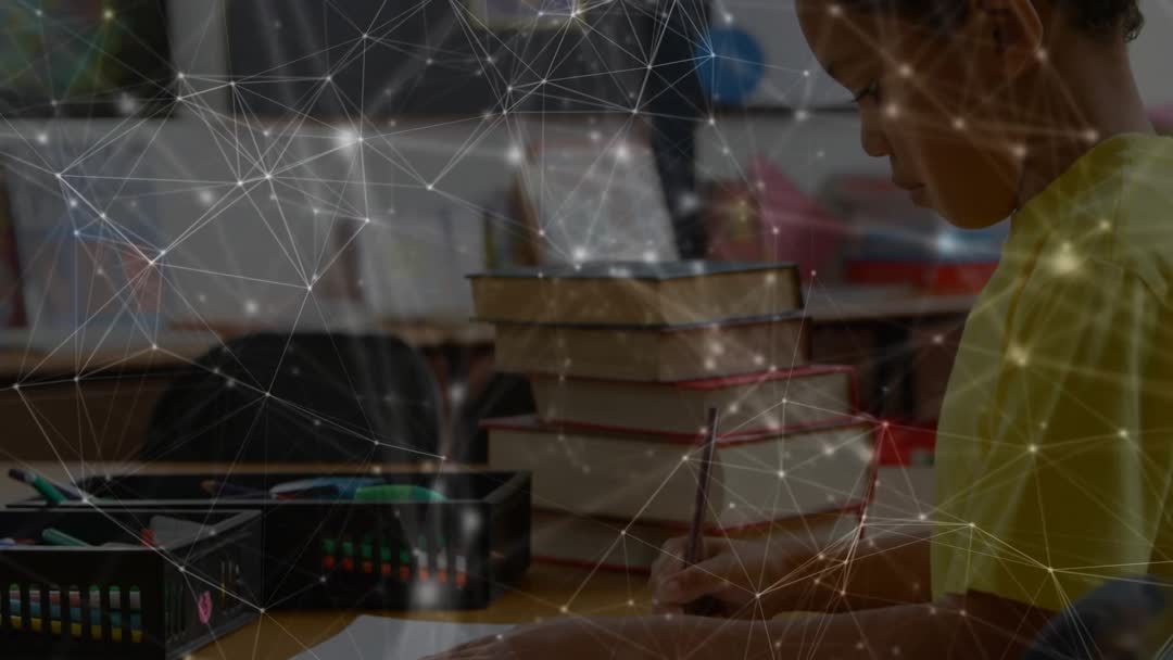 An intrigued young student in a classroom focuses on an assignment with a backdrop of several books enhancing the immersive learning atmosphere. The overlay of network connections symbolizes the interconnected learning process and modern educational technology integration. This visual is valuable for educational content creators, illustrating themes of innovation in education and focus in academic settings.