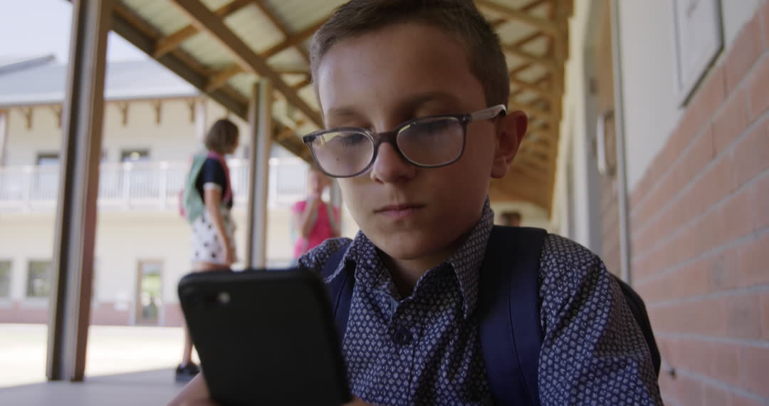 A young Caucasian boy is deeply focused on his smartphone while sitting in an outdoor school corridor during break time. The background shows other students milling around. The video might be used in educational blogs or articles discussing technology's role in students’ daily lives, as well as for advertising school-related tech products.