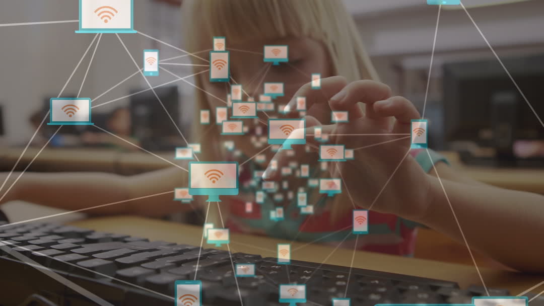 Illustrates young student interacting with digital network, highlighting importance of technology in modern education. Useful for content related to digital literacy, global connectivity, or future learning environments.