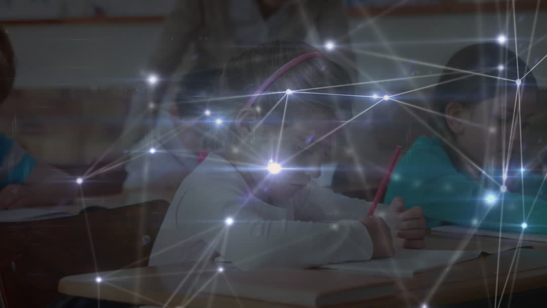 Young student participating in classroom activities with digital networks overlay, symbolizing the integration of technology in modern education. Useful for articles on educational technology, future classrooms, or innovations in child learning.