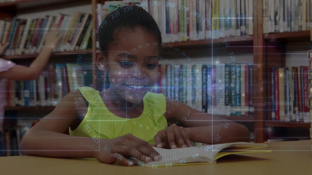 Young girl smiling while reading a book, sitting at a table in a library filled with shelves. Interactive elements produced by floating info panels suggest modern technology learning tools. Useful for educational videos related to childhood development, promoting literacy, childhood education technology, and fostering curiosity in a creative learning environment.