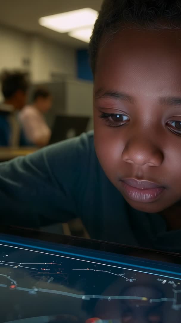 AI Generated Video. Close-up vertical video showing young student touching touchscreen while exploring interactive star map in classroom lab. Warm soft overhead lighting creating intimate learning mood, shallow depth of field keeping background classmates blurred. Footage fitting education technology promotions, e-learning tutorials, STEM outreach, tablet app demonstrations, and vertical social ads. Ideal for Instagram Reels, TikTok, YouTube Shorts, school website hero sections, or elearning course intros. Editing ideas include adding subtle motion graphics, ambient sound, soft piano music, and animated labels to highlight constellations and interface elements.