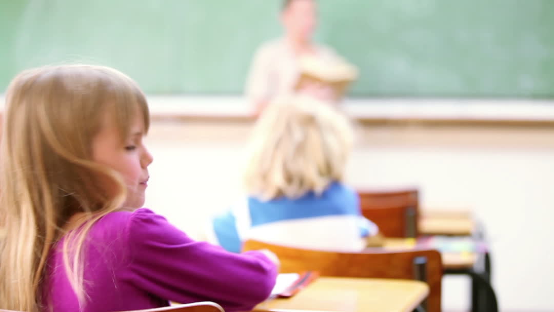 Young girl with blonde hair sits at her desk in a primary school classroom, smiling as she engages in the lesson. The presence of desks and a chalkboard hints at an interactive educational environment. This school scene captures the joyful and attentive atmosphere often found in learning experiences. Useful for educational materials, advertisements related to academic programs, or promoting positivity in learning spaces.