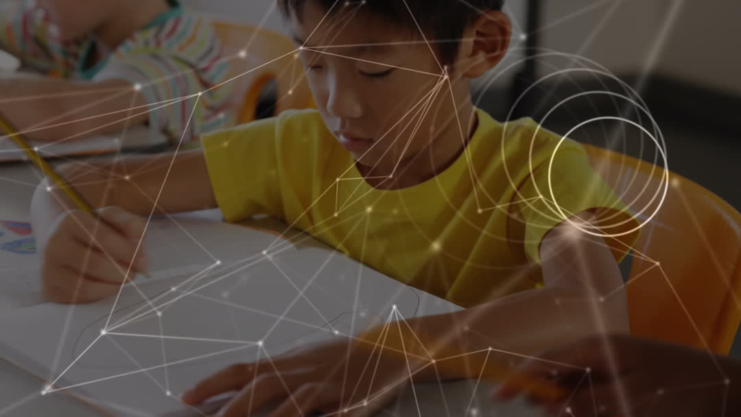 Boy in yellow shirt focusing on writing in classroom setting, with abstract digital network overlay symbolizing connectivity and modern education. Useful for educational campaigns, technology and innovation in learning, or promotional content about modern classroom environments.