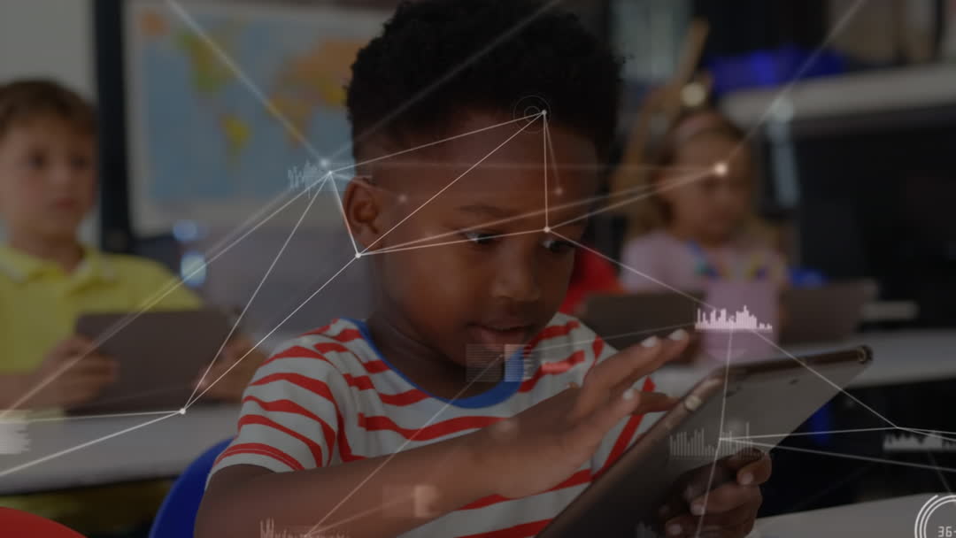 - Young Student Using Tablet in Classroom with Digital Technology Overlay