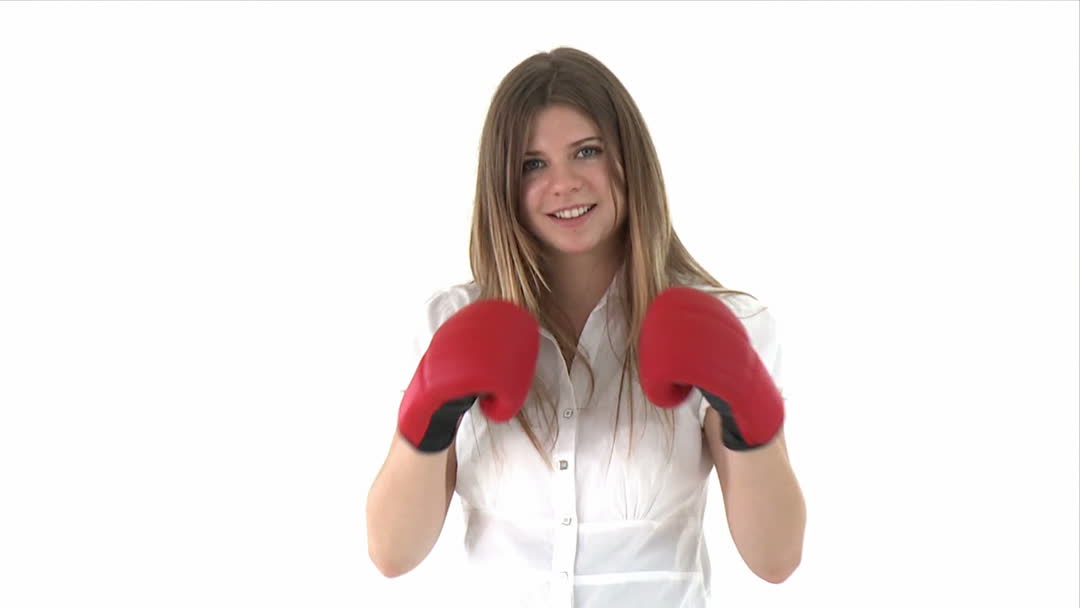 A young woman stands confidently wearing boxing gloves, exuding readiness and focus. The clear white background provides a versatile space, ideal for concepts in self-defense, empowerment, youth activities, fitness training, and sports promotion. Perfect for use in advertisements, motivational materials, and educational content about staying active and healthy.