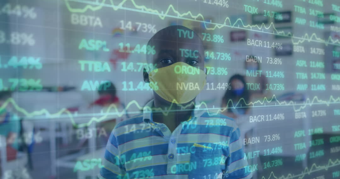 A schoolboy wearing a face mask is seen with a background overlay of stock market data animations, reflecting concepts of technology and financial education. It could be used in contexts highlighting digital learning in finance, the intersection of economics and education relative to pandemic safety measures, or online educational programs in finance.