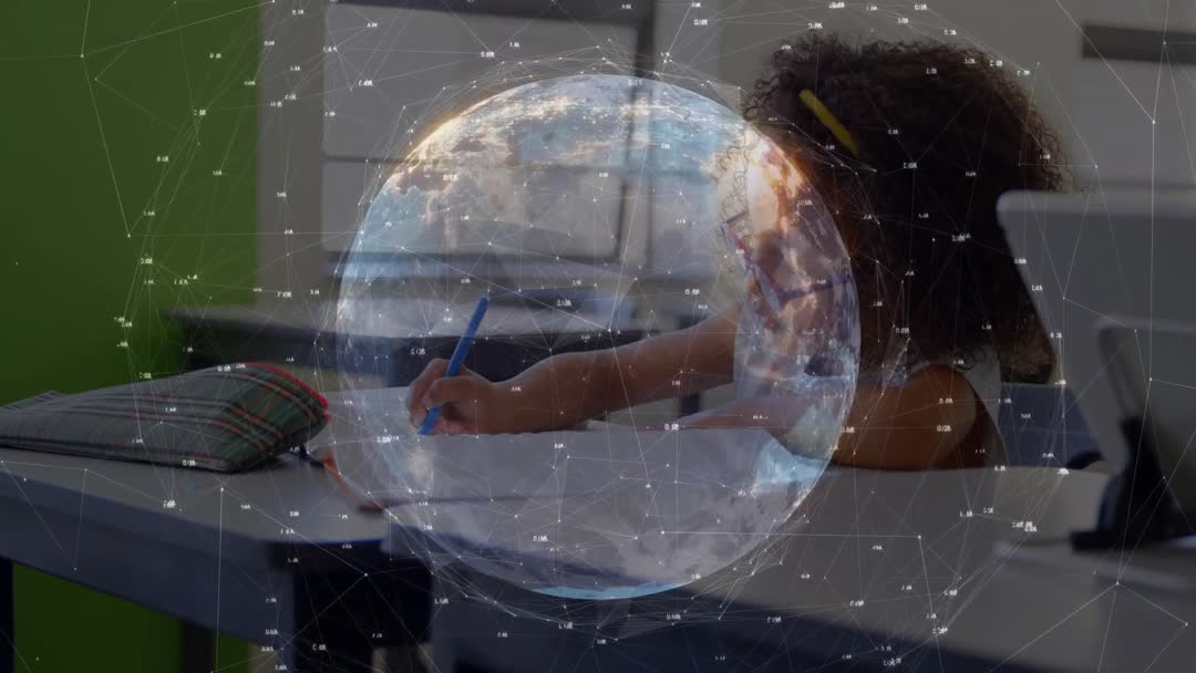 The video features a young girl diligently writing in a notebook, with a digitally imposed rotating globe, symbolizing global education and connectivity. This visual can be used for promoting educational programs, learning apps, or articles discussing the integration of technology in education to highlight how learning transcends geographical boundaries.