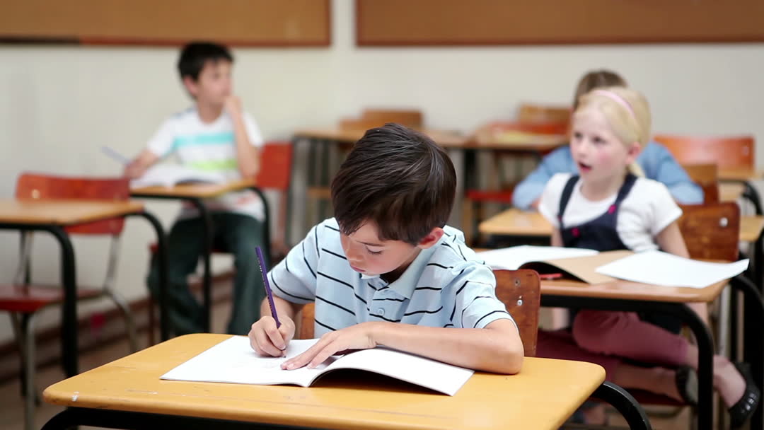 Young students studying in a classroom, creating an academic atmosphere. This videory captures focus and education, ideal for use in educational content, promoting classroom learning, and developing school-related materials.