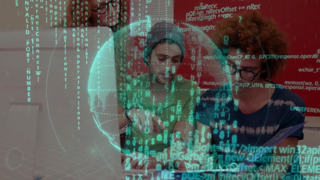 Young team collaborating on coding project with holographic globe and code overlay Video