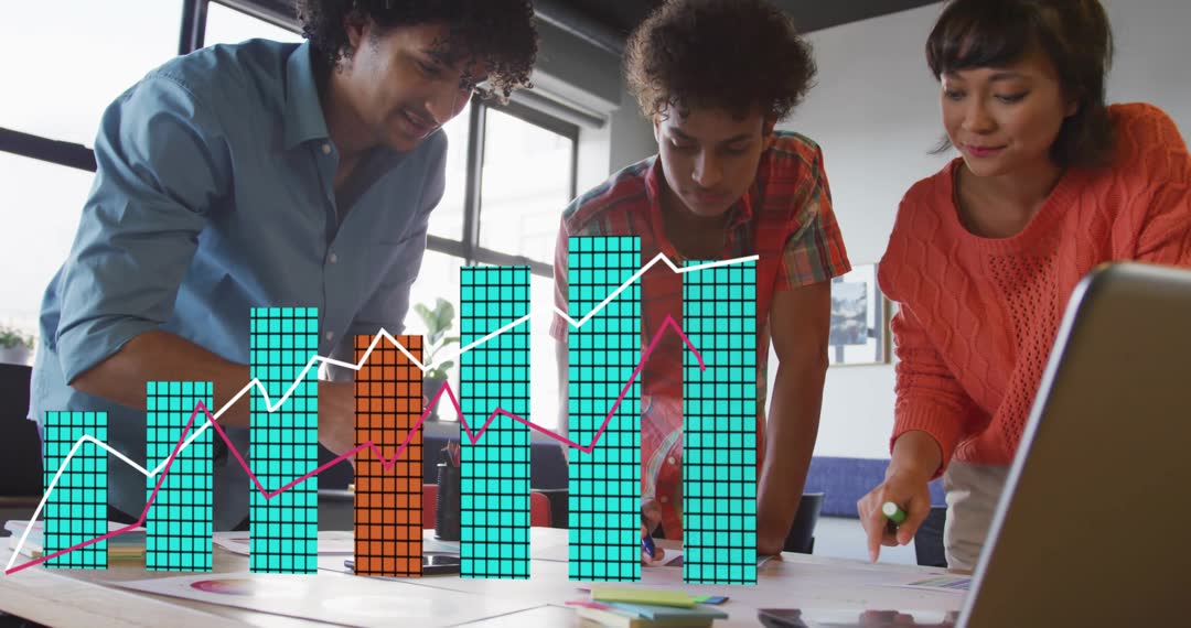 Video showing young team collaborating over table while analyzing rising charts and drawing strategy notes. Bright office daylight illuminating workspace and laptop screen. Scenes emphasizing data-driven decision making, teamwork, creative brainstorming, and planning. Use for business presentations, startup pitch reels, corporate training videos, marketing campaigns, annual reports, and website hero banners. Suitable for topics like analytics, growth strategy, financial forecasting, project planning, and team productivity. Colorful infographics overlay adding visual emphasis to data trends. Clip working well for social media ads, pitch decks, online courses, investor updates, and internal communications.