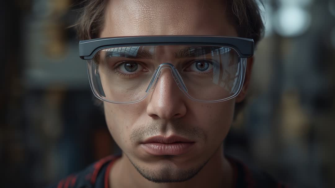 AI Generated Image. Close-up video showing young male technician wearing clear safety goggles and staring into camera with intense focus. Workshop background staying blurred, highlighting facial expression and reflective goggles. Serving safety training, industrial website banners, equipment packaging, occupational health campaigns, STEM recruitment, e-learning modules. Working well for hero shots, background loops, short social ads, and product demos. Recommending slow push-in editing, soft vignette, warm color grade, subtle ambient workshop sound to enhance mood. Providing optional text overlay space above forehead or below chin for headline or logo. Supporting horizontal framing for full-screen web video and widescreen commercial use.