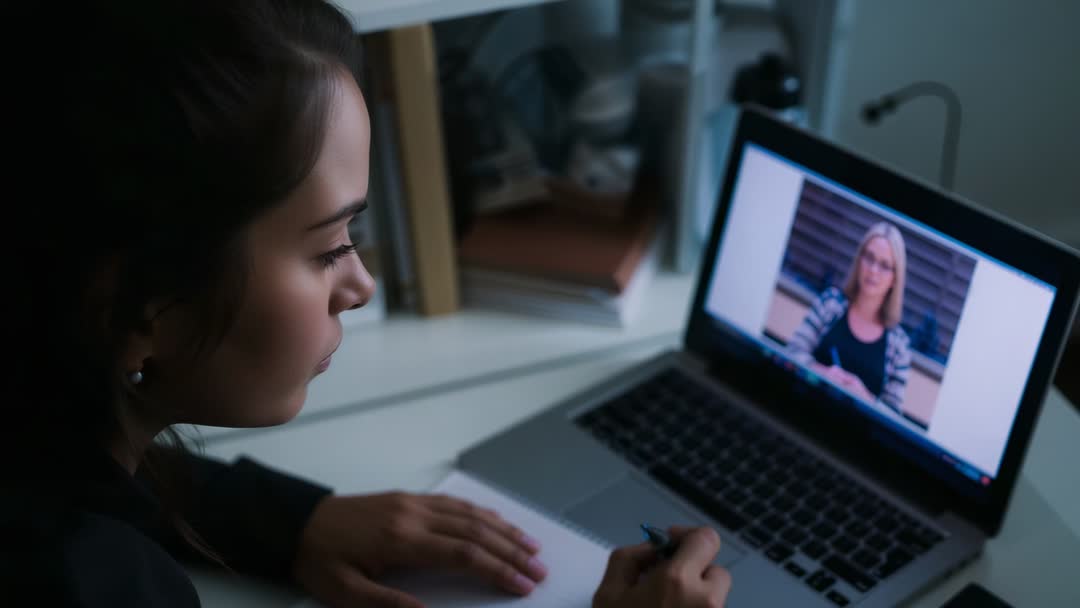 AI Generated Image. Video showing young woman attending late-night online lecture while taking handwritten notes at home desk. Composition highlighting screen-to-notebook interaction, low-light ambiance, and focused expression. Serving education and technology themes by illustrating distance learning, virtual classrooms, study habits, and adult learning. Suggesting uses including hero banners, e-learning course pages, social media ads, blog headers, editorial features, and video thumbnails. Working well for marketing material about online courses, student productivity tools, study tips content, and remote work or learning reports. Supplying room for cropping to portrait or landscape for mobile-first and desktop layouts.