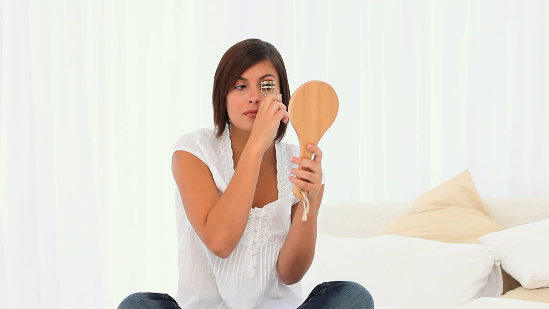 - Young Woman Curling Eyelashes in Comfortable Bedroom Setting