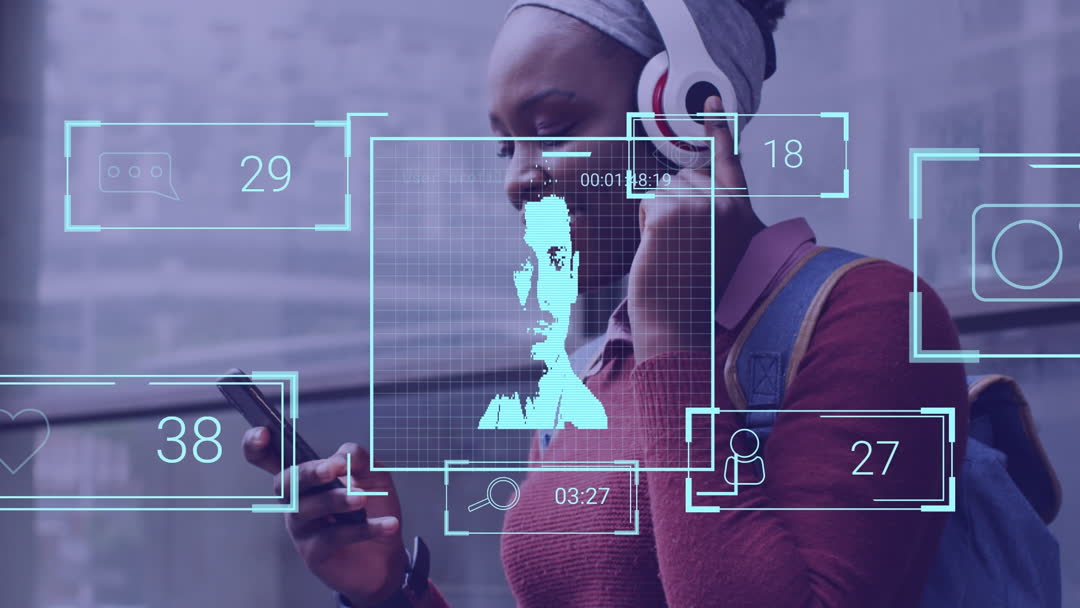 An African American woman listens to music with headphones while engaging with her smartphone. Digital overlays showing social media interactions add dynamics, highlighting the integration of technology in communication. Useful for themes related to digital life, social media engagement, or technological advancements.