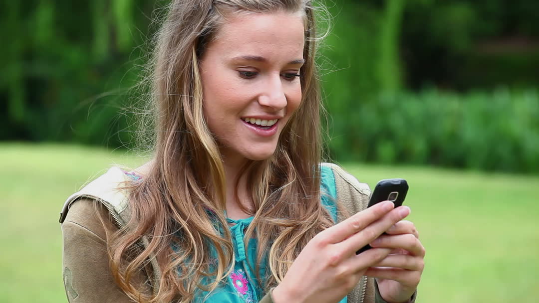 - Young Woman Enjoying Mobile Phone in Park Setting