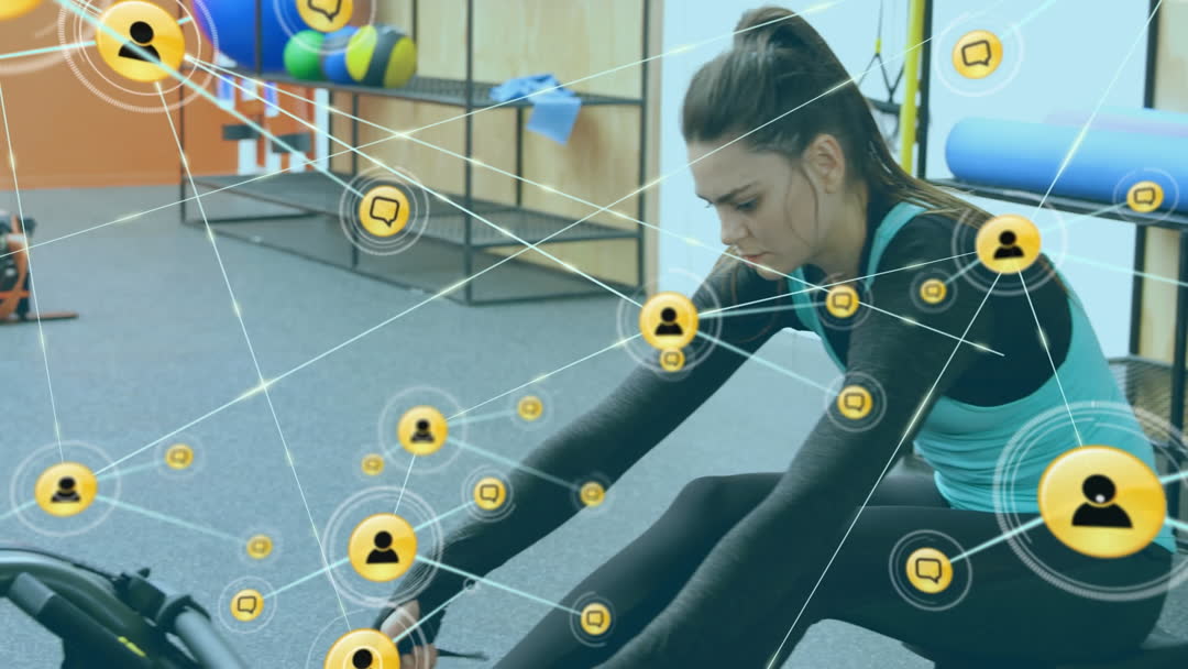 Young Woman Exercising with Digital Network Overlay in Gym Video