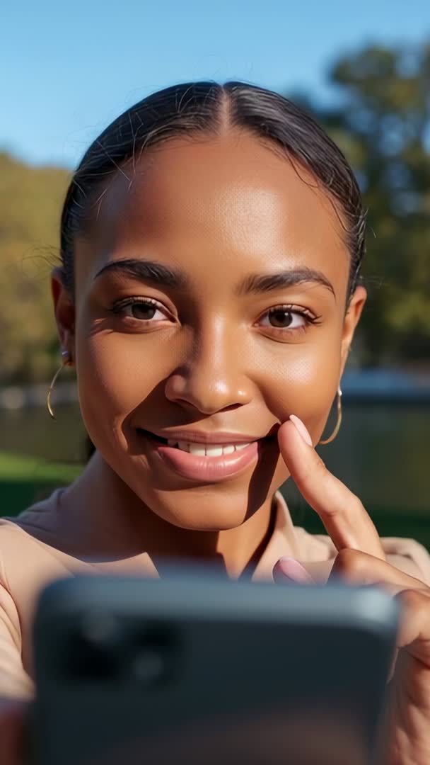 AI Generated Image. Close-up vertical video showing young woman filming selfie at lakeside, tapping cheek and smiling while wearing hoop earrings and light makeup. Warm golden-hour light highlighting skin tone and facial features, shallow depth of field keeping background softly blurred. Ideal for social media campaigns and influencer marketing, mobile app onboarding, vlogging thumbnails, beauty and lifestyle content, dating app promotional creative. Use as hero clip for Instagram Reels, TikTok, YouTube Shorts, promo banners, website headers, ad spots promoting beauty products, mobile apps, outdoor lifestyle. Composition working well for split-screen layouts, overlay text, branded stickers, while maintaining strong eye contact and friendly vibe. Finger gesture tapping cheek adding playful interactive element for tutorials, makeup demos, or call-to-action prompts.