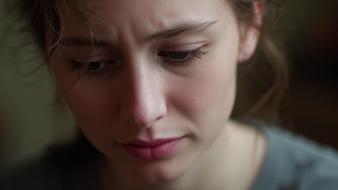 AI Generated Video. Closeup video showing young woman furrowing brow and lowering gaze, loose hair framing face, grey shirt visible. Mood conveying introspection, concern and vulnerability, with soft natural light emphasizing skin texture and subtle emotion. Footage working well for mental health awareness, counseling and therapy promotions, editorial features on stress and youth wellbeing, social media posts, documentary B-roll, online courses on emotional intelligence, and stock footage packs. Clip pairing well with overlay text, quote graphics, web headers, video intros, and advertising for health apps or support services. Clean composition and neutral background allowing easy color grading and cropping for multiple aspect ratios.