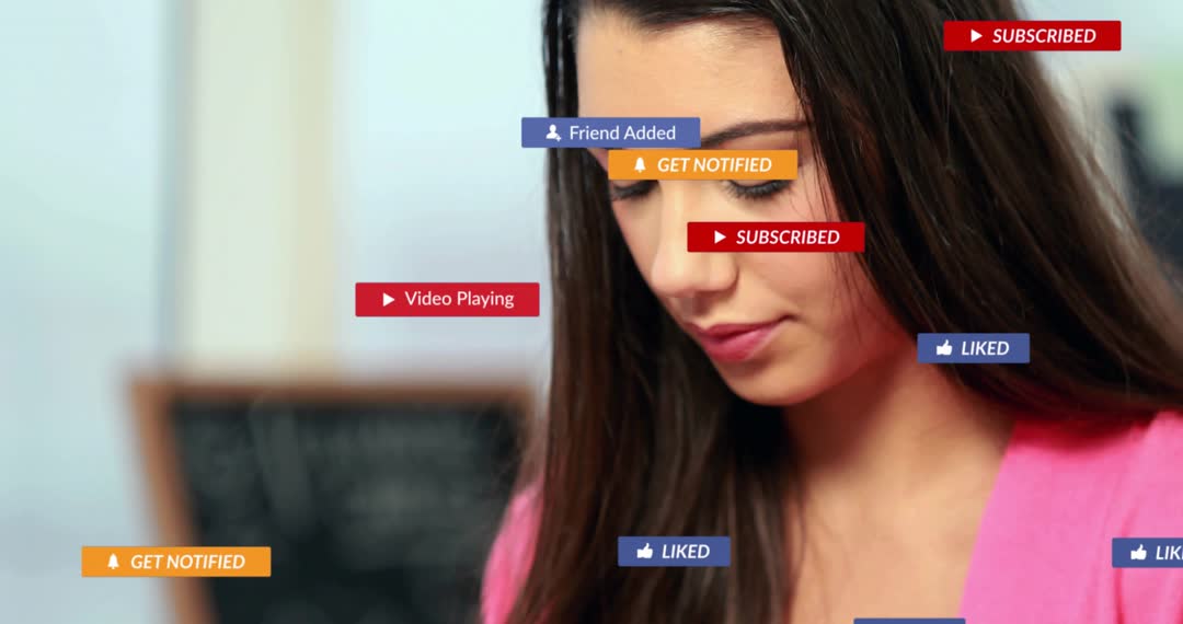 Showing young woman leaning over tablet while animated social media badges and notifications float across screen. Featuring badges such as liked, subscribed, friend added, get notified, video playing to illustrate online engagement and content interaction. Working well for social media marketing, app demo, influencer tutorial, education and online course promos. Suggesting uses: YouTube intro, website hero, ad campaign, app store preview; adding voiceover and extra motion graphics for stronger messaging. Presenting vibrant colors, shallow depth of field, minimalist desk with chalkboard hint for casual study vibe. Allowing editors to crop for vertical or square formats and to overlay text blocks or call-to-action buttons.