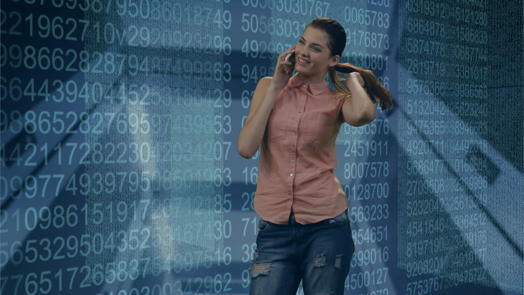 Young woman in casual clothes holding an engaging conversation on a smartphone. In the background, a digital display of numbers overlays a data center, juxtaposing human interaction with the world of technology. Perfect for illustrations related to technological innovations, communication solutions, and modern lifestyle in AI-driven environments.