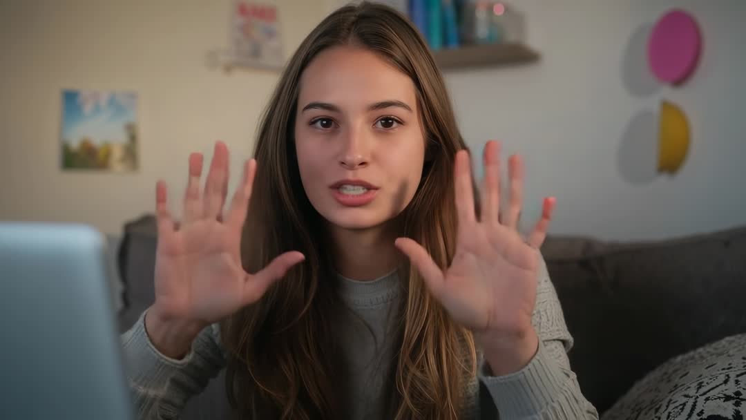 AI Generated Image. Young woman sitting on sofa, wearing knit sweater, speaking to camera while raising both hands. Laptop visible in foreground, bookshelf and wall decor visible in background. Camera angle framing face and hands for engaging, conversational composition. Warm, natural lighting and shallow depth of field creating intimate, homey atmosphere. Suitable for video thumbnail, social media post, vlog intro, remote work article, online course promo, influencer channel, product demo, or communication tutorial. Use for illustrating topics such as virtual meetings, public speaking tips, online teaching, lifestyle vlogging, digital communication, and social media marketing. Editing suggestions: crop to 16:9 for widescreen, add lower thirds or caption overlays, apply subtle color grading for soft skin tones, pair with upbeat background music for energetic intro.
