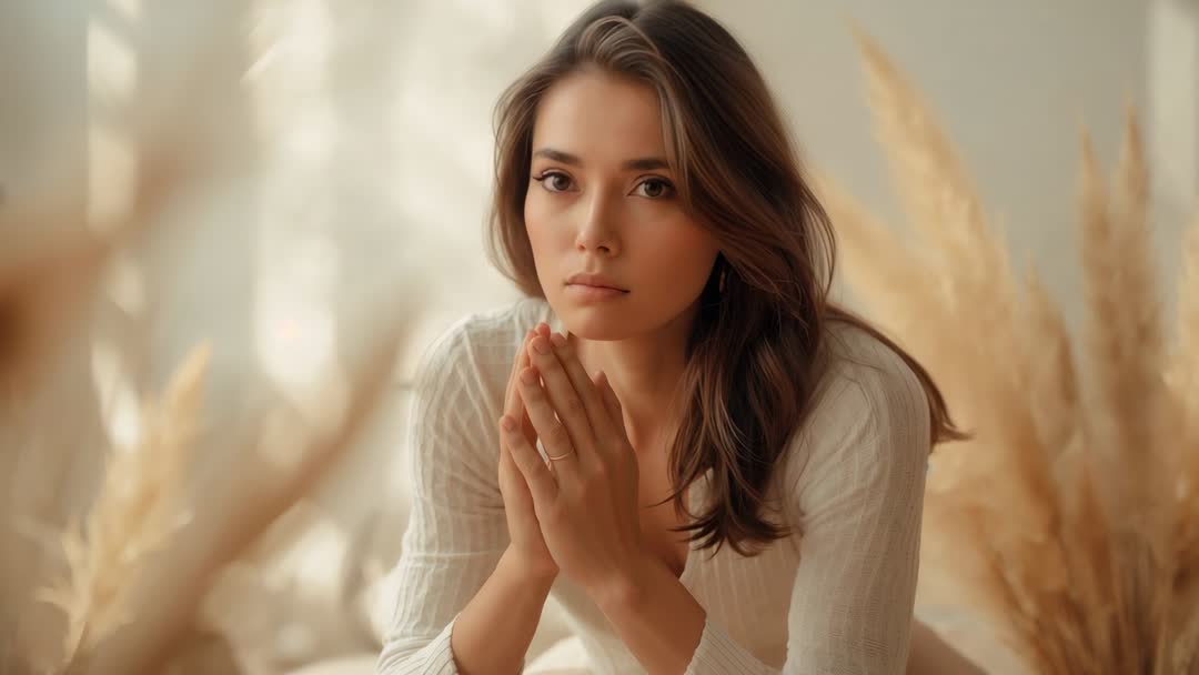 AI Generated Image. Showing young woman pausing and reflecting with clasped hands and gentle expression. Featuring soft natural light, warm neutral palette, pampas grass background, and cozy sweater for intimate mood. Working well for wellness and mindfulness video content, guided meditation clips, therapy and mental health campaigns, lifestyle and slow living channels. Serving as hero clip for websites, social media reels, app intros, online courses, and editorial stories about introspection and self care. Allowing text overlay, lower third, or logo placement in negative space near frame edges. Recommending subtle color grade toward warm tones, slow fades, and ambient sound design to enhance calming atmosphere.