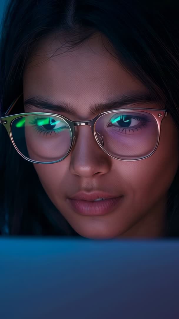 AI Generated Image. Featuring close-up of young woman wearing glasses and looking at laptop screen, showing concentrated expression and soft LED reflections. Vertical 9:16 framing and tight crop emphasizing facial details and screen reflections on lenses. Lighting combining cool blue and purple tones creating cinematic, focused mood. Serving well for editorial content on productivity, digital lifestyle, coding, data analysis, research, online learning, and UX case studies. Useful for tech blog hero, e-learning thumbnail, cybersecurity campaign, corporate presentation, social media vertical ad, app demo, startup pitch, or remote work feature. Editing tips: overlay headline in top third, add call-to-action at bottom, apply subtle slow zoom for short loop, keep color grade cool to preserve LED ambiance. Licensing suggestions: use in promotional reels, training modules, app store previews, blog headers, or LinkedIn posts focused on technology and innovation.