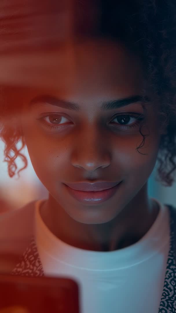 AI Generated Image. Close-up vertical clip showing young woman reading smartphone message while smiling softly under warm mixed lighting. Composition focusing on facial expression and hand-held device, conveying contemplation, warmth, intimacy, quiet joy. Curly hair framing face adding natural texture and authenticity. Vertical orientation matching mobile-first platforms and apps. Usage suggestions: - Using for hero clip, messaging app promo, social media campaign, dating platform, mobile UI demo - Using in blog or editorial about digital communication, mental wellbeing, modern relationships, cozy night routines - Using for advertising lifestyle brands, beauty and skin care, tech accessories - Using as B-roll for documentary or short film about youth, introspection, online culture Technical notes: - Vertical 9:16 composition working well for Instagram Reels, TikTok, Snapchat, mobile ads, story formats - Close-up framing allowing cropping for square or horizontal use while preserving emotional focus - Color grading offering warm red and cool blue contrast for cinematic mood