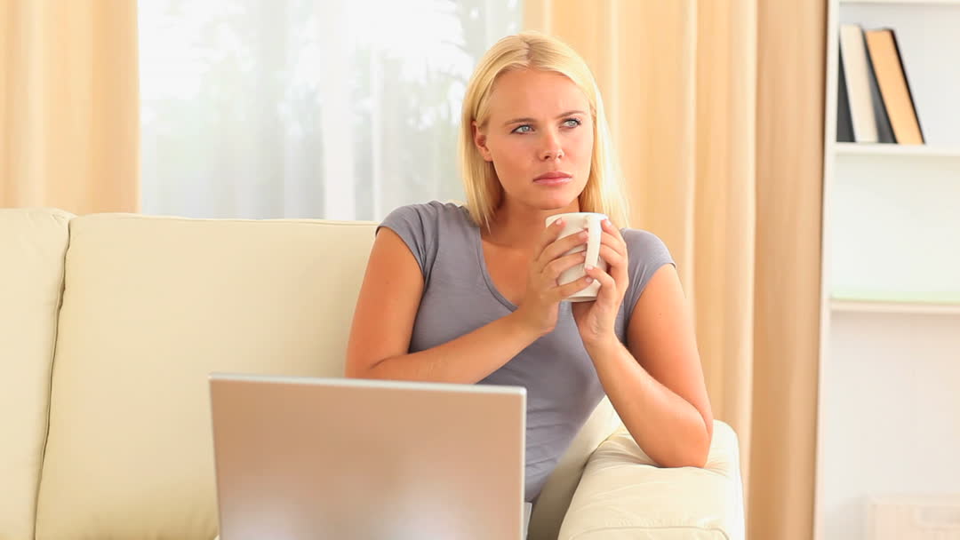 - Young Woman Reflecting with Coffee and Laptop on Comfortable Sofa