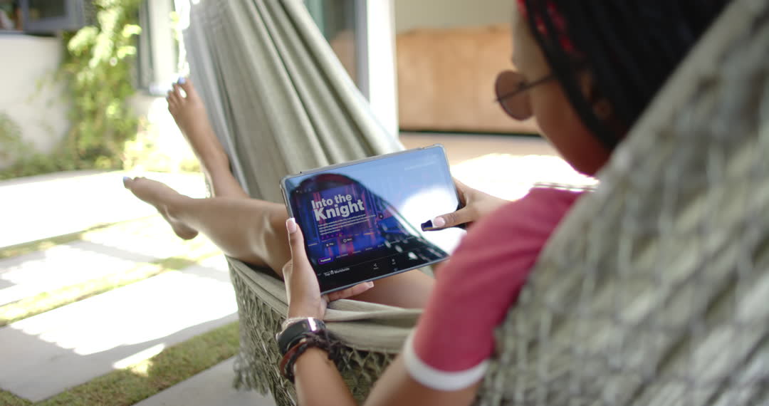 - Young Woman Relaxing in Hammock with Tablet Watching Show