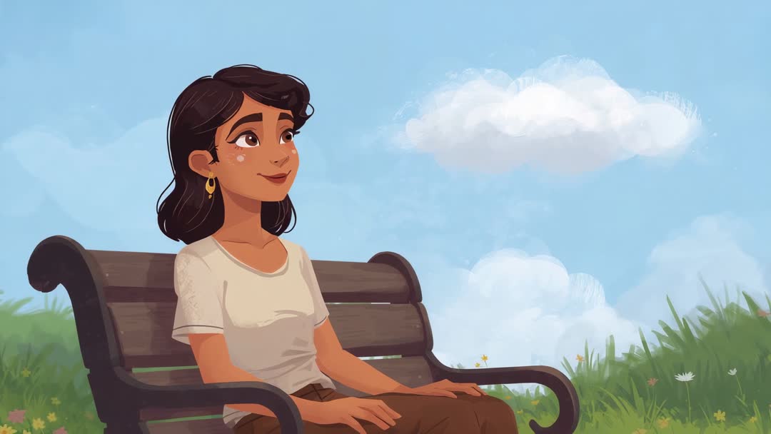 AI Generated Image. Clip showing young woman sitting on wooden park bench, turning head to watch clouds drifting across bright blue sky. Character wearing white shirt and gold hoop earrings, smiling softly while enjoying calm meadow atmosphere. Hand-drawn animated style featuring soft brush textures and warm pastel palette, with subtle motion in grass and clouds creating meditative mood. Composition placing subject on left third with open sky on right, leaving space for text overlays, titles, or logo. Ideal for wellness and meditation videos, social media reels, web banners, children story animations, educational content, or loopable background for apps and presentations. Export suggestions: horizontal 16:9 framing, 24-30 fps, provide 4K and 1080p versions, include seamless loop for continuous playback. Suggested search tags and uses: relaxation, mindfulness, calm visual, nature illustration, animated character, sunny day, mood booster, background asset.
