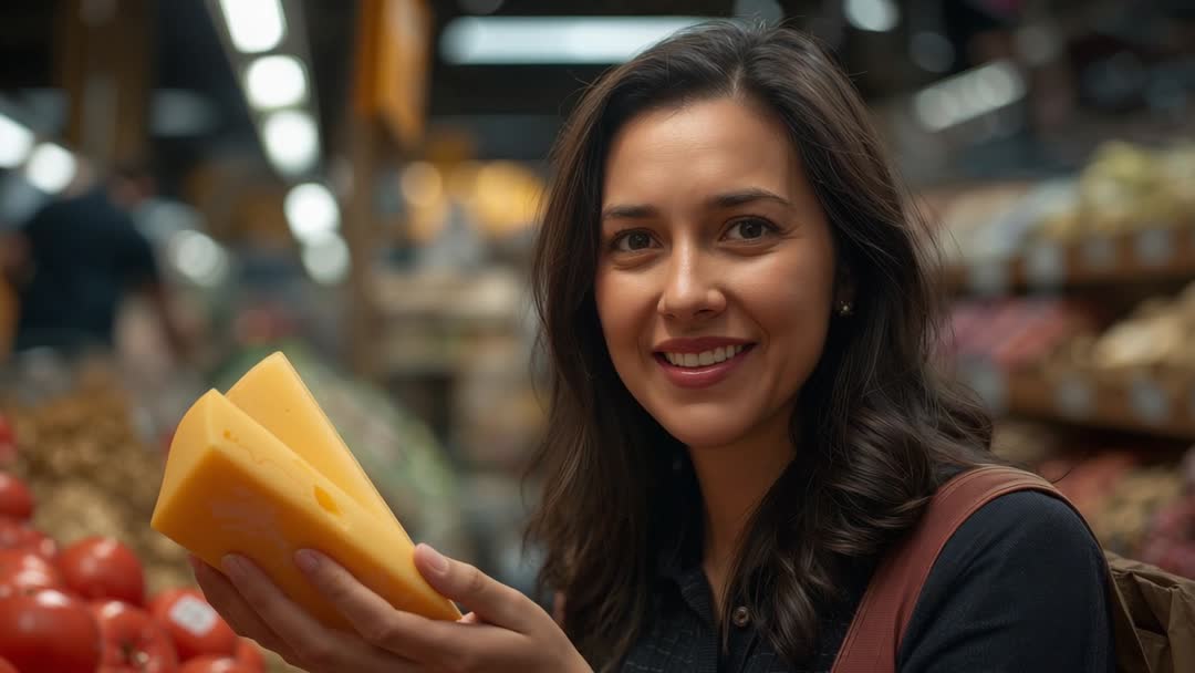 AI Generated Video. Video clip showing young woman smiling and holding cheese wedges while standing in busy produce aisle of grocery market. Camera-facing gaze creating candid, friendly atmosphere with warm lighting and shallow depth of field keeping subject in focus while background showing blurred produce and shoppers. Working well for advertising cheese brands, grocery store promotions, lifestyle content, cooking blogs, social media posts, e-commerce banners, recipe videos, and editorial about shopping habits. Clip lending authentic, relatable feel for hero shot, product demo, testimonial, or stock footage use in retail and food-related projects.