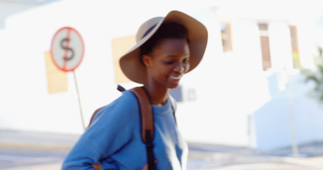 Young woman leisurely walking in an urban area wearing a stylish hat and carrying a backpack. Her cheerful expression and relaxed posture reflect a sense of contentment and freedom, ideal for portraying themes of casual urban lifestyle, fashion, and travel. Suitable for use in articles or advertisements focusing on modern city life and personal journeys.