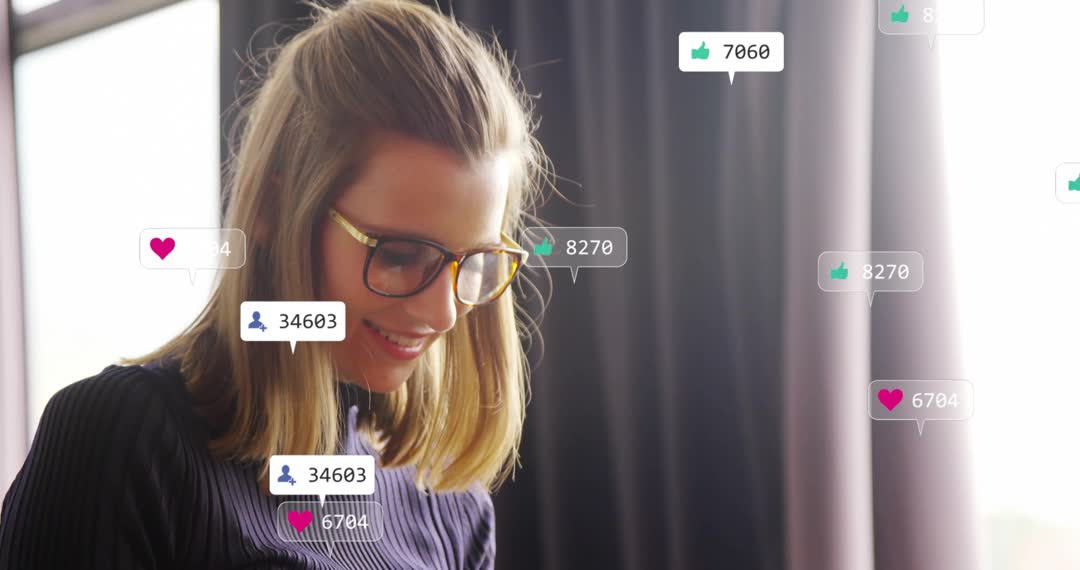 Close-up video showing young woman tapping tablet while social media notifications and follower counts floating around head. Warm backlit composition creating modern tech mood. Glasses and soft smile conveying friendly influencer presence. Notification overlays showing likes, hearts, follower numbers and thumbs-up icons. Serving social media marketing, influencer campaigns, app landing pages, webinar promotions, blog posts about online engagement, presentations on digital strategy, advertising for streaming platforms, online course thumbnails. Horizontal frame and natural window light supporting flexible cropping for banners, hero headers, social stories and mobile formats. Color palette featuring soft neutrals with accent green and pink from notification icons, making visual hooks for call-to-action and UI demos.