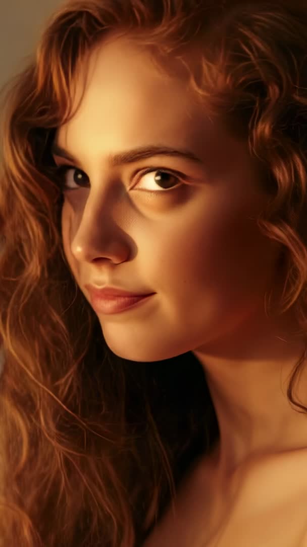 AI Generated Image. Video showing closeup of young woman turning head toward camera and smiling with direct gaze. Curly hair framing face while bare shoulders and warm golden studio lighting creating soft skin tones and gentle shadows. Vertical composition optimizing for mobile-first platforms and portrait-orientated storytelling. Suiting beauty and skincare campaigns, influencer intros, dating app promos, social media reels and shorts, thumbnail hero shots, product overlays, casting reels and editorial features. Pairing with soft piano or ambient track while applying warm color grade to enhance golden tones. Cropping for tighter headshot or expanding canvas for full-frame sequence. Fitting licensing for commercial advertising, website banners, app onboarding screens and social ad campaigns.