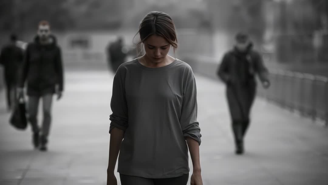AI Generated Video. Video clip showing young woman walking alone on city bridge, head tilted down, sleeves rolled, pedestrians passing in blurred background. Creating moody monochrome atmosphere, emphasizing solitude, introspection, urban anonymity. Suiting projects exploring loneliness, mental health, commuter fatigue, personal reflection, urban lifestyle, social isolation campaigns. Working well as background B-roll for documentaries, news packages, corporate wellness content, blog headers, social media reels, commercial ads needing emotional tone. Leaving space on right side for text overlay or lower thirds, suggesting slow fade and ambient soundtrack for dramatic effect. Allowing easy cropping for vertical formats and color grading options from strict monochrome to subtle desaturation for cinematic look.