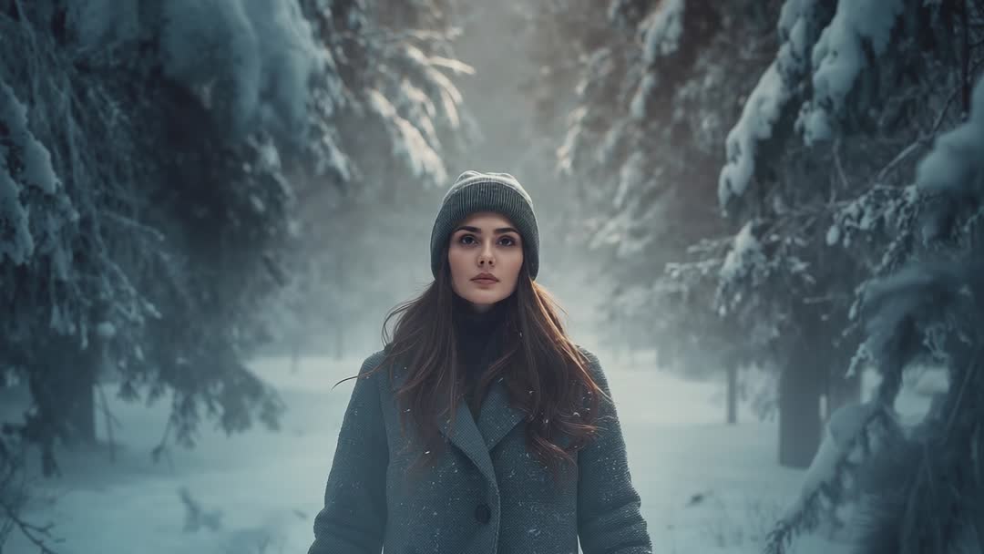 AI Generated Video. Featuring young woman walking along snow-dusted path, lifting head as soft flakes fall and mist drifts between tall pine trees. Cinematic mood created by cool tones, shallow depth of field, and soft directional light coming through canopy. Close-to-mid shot focusing on facial expression and layered winter clothing while background remains atmospheric. Useful for promoting winter outerwear, showcasing knit beanie and wool coat, and illustrating calm, reflective moments in nature. Ideal for editorial storytelling, lifestyle and fashion campaigns, wellness and mindfulness content, travel and outdoor adventure features, and holiday or seasonal marketing. Works well as hero footage for website headers, background B-roll for commercials, social media reels, or cinematic cutaways in short films. Recommend leaving upper negative space for text overlay and applying subtle color grade for moody, desaturated look.