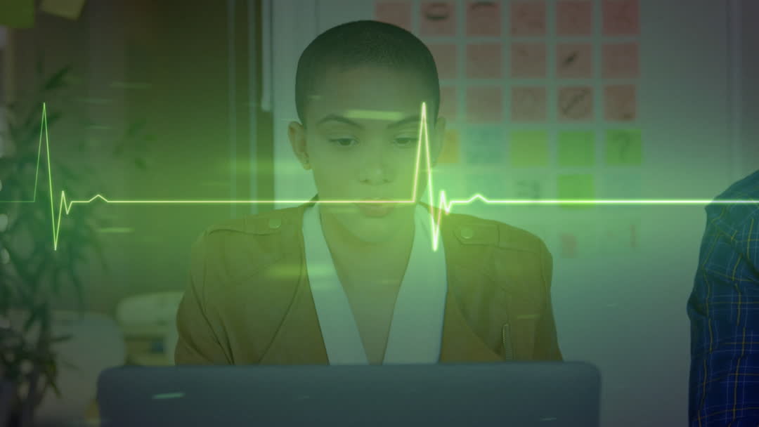 A young woman is deeply engaged in her work on a laptop, with an animated lifeline effect layered over the scene, indicating connectivity and technology integration. This videory represents the intersection of health and business industries, making it suitable for projects related to health tech, modern business solutions, interactive designs, and digital innovation narratives.